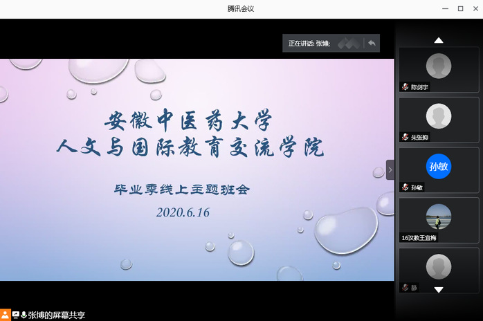 六月季夏,栀香安中,站在凤凰花开的十字路口,虽不舍,终究同学们还是要远走。6月16日晚6:30,人文与国际教育交流学院召开毕业季线上主题班会。会议由人文与国际教育交流学院党总支副书记张博主讲,毕业班辅导员、全体毕业生参与线上会议。