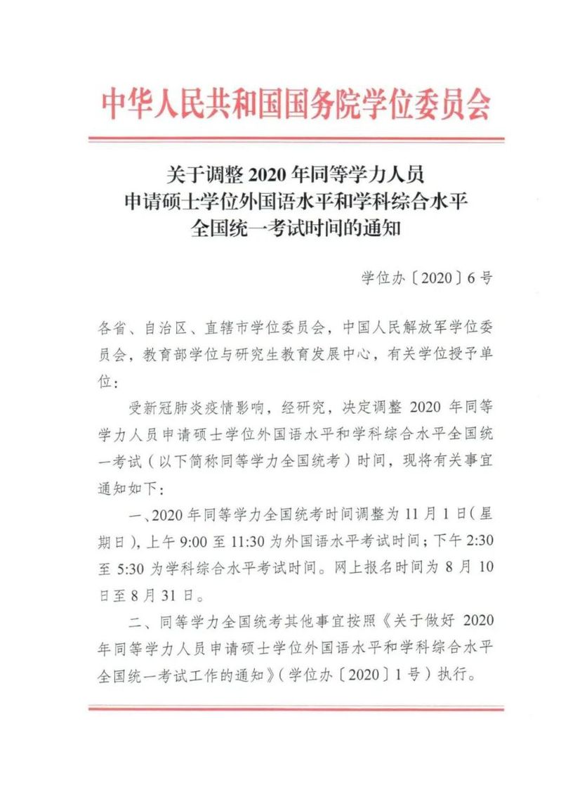 调整后的同等学力全国统考将于2020年11月1日(星期日) 举行,网上报名时间为8月10日至8月31日。