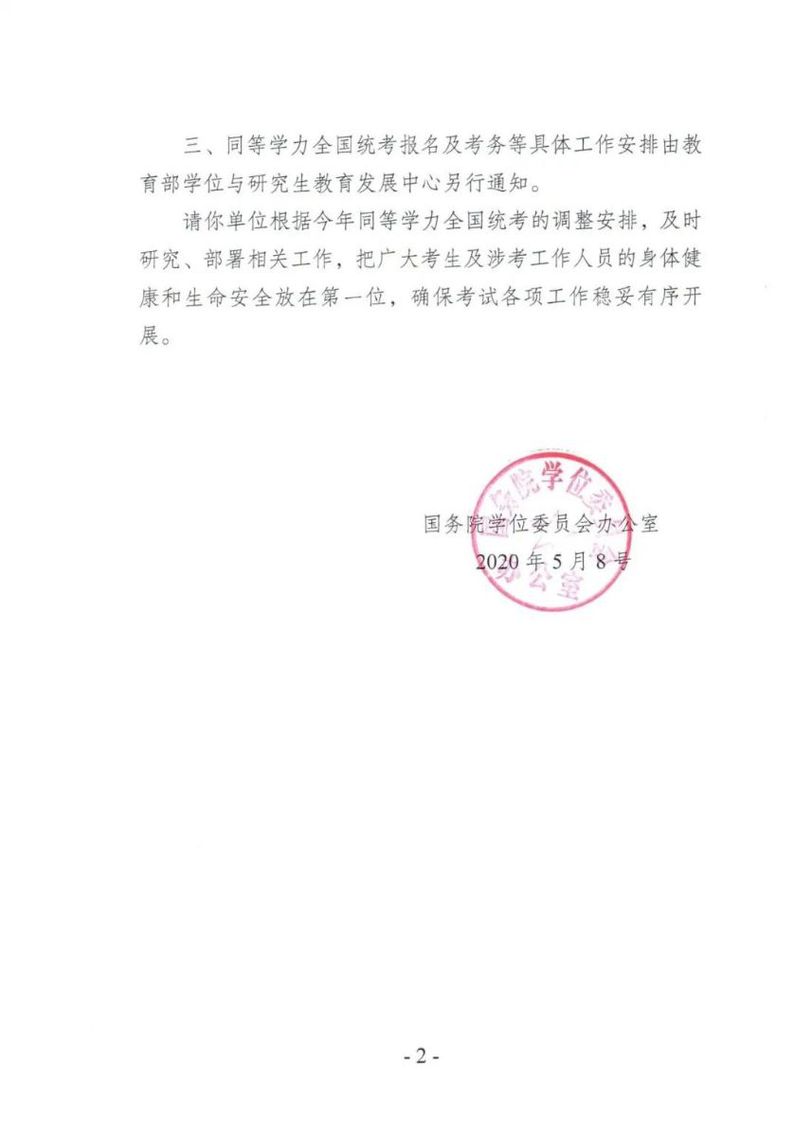 为贯彻落实党中央、国务院关于新冠肺炎疫情防控工作有关精神,切实保障广大考生及工作人员的身体健康和生命安全,对原定于5月24日进行的2020年同等学力人员申请硕士学位外语水平和学科综合水平全国统一考试时间(以下简称同等学力全国统考)进行了调整。