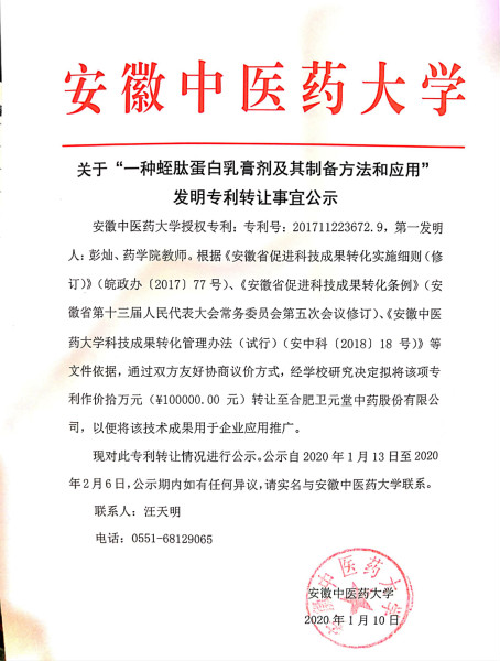 关于“一种蛭肽蛋白乳膏剂及其制备方法和应用”发明专利转让事宜公示